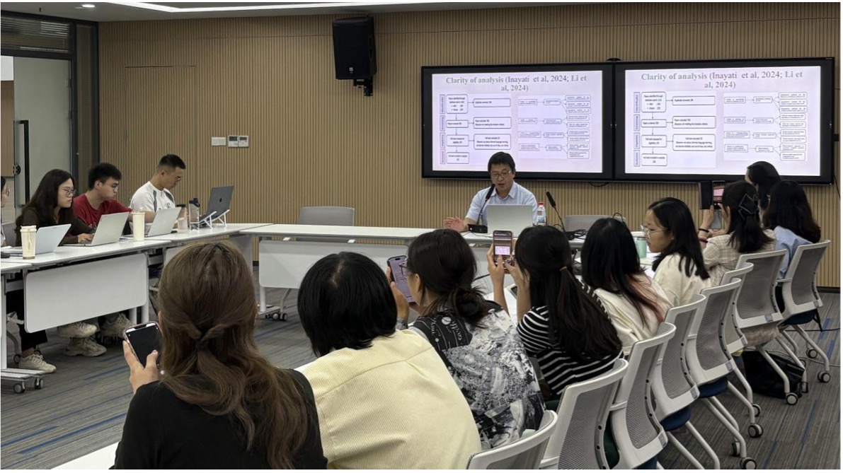 在互动环节中,与会师生就综述文章的文献数量、AI工具在文献综述中的应用、系统综述的结构安排、文献分类与记录方法等问题踊跃提问。高雪松教授耐心解答了每一个问题,特别是在谈及AI工具时,他提出了“Every convenience means opportunity lost. ”这一发人深省的观点,强调在学习初期过度依赖AI工具会妨碍独立学习能力和记忆肌肉的形成,建议研究者首先提升个人能力和辨别力,再将AI作为辅助工具而非依赖对象。在场师生与高雪松教授积极互动,讲座内容丰富,讲解深入,令广大参会者受益匪浅。本次讲座在热烈的氛围中圆满落下帷幕。